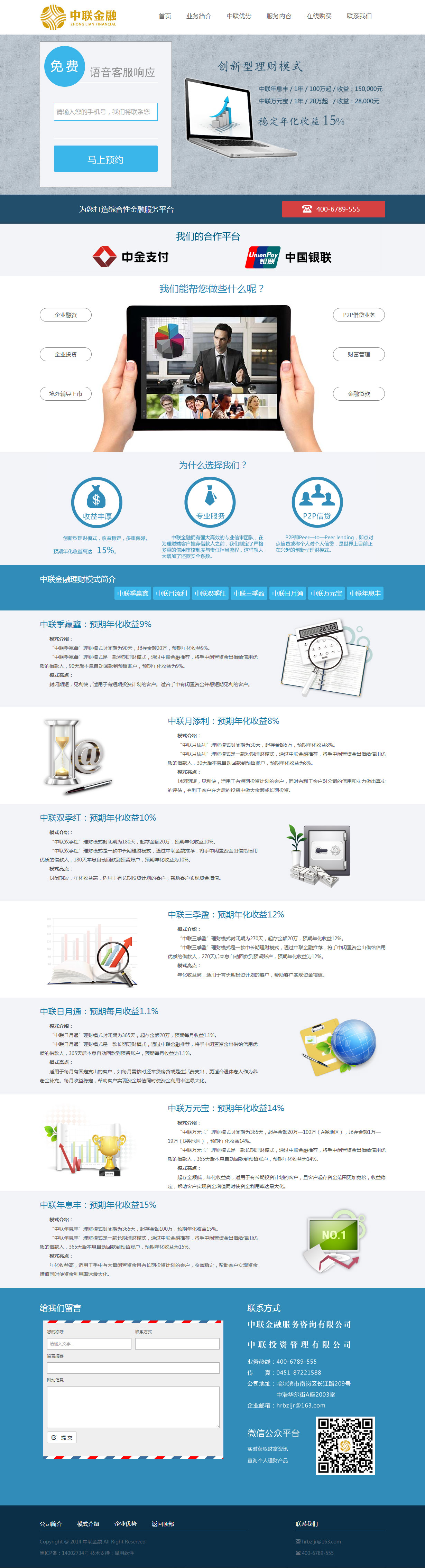案例描述:中聯(lián)金融服務(wù)咨詢有限公司、中聯(lián)投資管理有限公司為中聯(lián)集團旗下子公司,是經(jīng)國家批準規(guī)定許可經(jīng)營的金融投資公司,是中國互聯(lián)網(wǎng)金融協(xié)會會員單位,是專業(yè)從事小額貸款、行業(yè)投資、信用風(fēng)險評估、信用數(shù)據(jù)整合服務(wù)、融資咨詢及個人理財?shù)慕鹑诜?wù)機構(gòu);為有短期資金需求的個人、中小企業(yè)資金周轉(zhuǎn),項目引進,產(chǎn)品開發(fā)等進行資金出借、投資擔(dān)保,為有理財需求的個人進行出借服務(wù)咨詢。