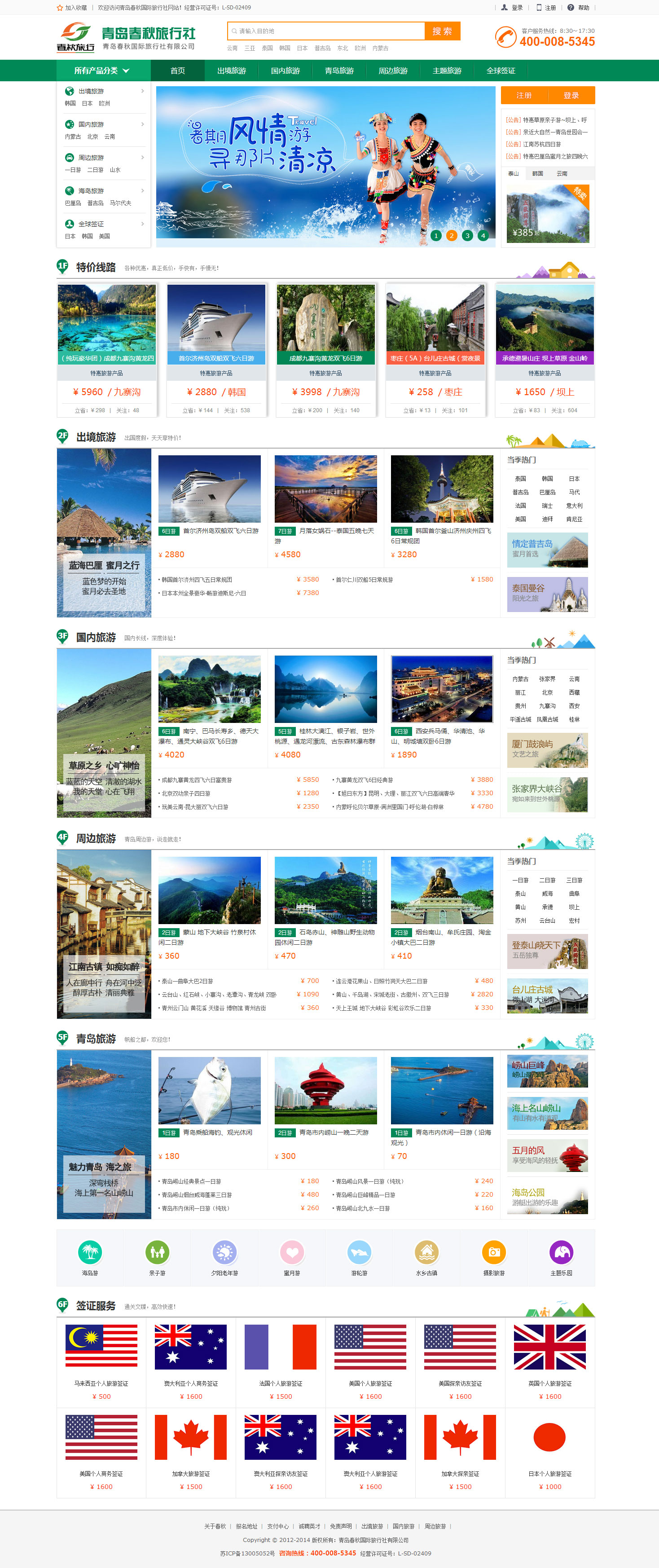 案例描述:青島春秋旅行社網(wǎng)站提供一站式個性化旅游路線,跟團(tuán)游+自由行+公司旅游.周邊游+國內(nèi)游+主題旅游!青島旅行社排名前列的旅游公司,滿意100%,報名熱線:400-008-5345!