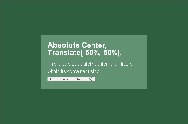 和“完全居中”法的好處一樣,簡單有效,同時(shí)支持可變高度。為內(nèi)容指定帶有廠商前綴的transform: translate(-50%,-50%)和top: 50%; left: 50%;樣式就可以讓內(nèi)容塊居中。
