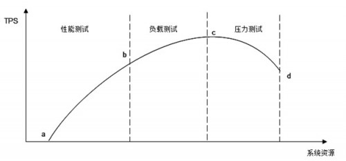 圖4.3中的橫坐標表示消耗的系統資源,縱坐標表示系統處理能力(吞吐量)。在開始階段,隨著并發(fā)請求數目的增加,系統使用較少的資源就達到較好的處理能力(a~b段),這一段是網站的日常運行區(qū)間,網站的絕大部分訪問負載壓力都集中在這一段區(qū)間,被稱作性能測試,測試目標是評估系統性能是否符合需求及設計目標;隨著壓力的持續(xù)增加,系統處理能力增加變緩,直到達到一個最大值(c點),這是系統的最大負載點,這一段被稱作負載測試。測試目標是評估當系統因為突發(fā)事件超出日常訪問壓力的情況下,保證系統正常運行情況下能夠承受的最大訪問負載壓力;超過這個點后,再增加壓力,系統的處理能力反而下降,而資源消耗卻更多,直到資源消耗達到極限(d點),這個點可以看作是系統的崩潰點,超過這個點繼續(xù)加大并發(fā)請求數目,系統不能再處理任何請求,這一段被稱作壓力測試,測試目標是評估可能導致系統崩潰的最大訪問負載壓力。