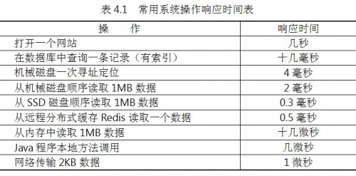 指應用執(zhí)行一個操作需要的時間,包括從發(fā)出請求開始到收到最后響應數據所需要的時間。響應時間是系統最重要的性能指標,直觀地反映了系統的“快慢”。表4.1列出了一些常用的系統操作需要的響應時間。