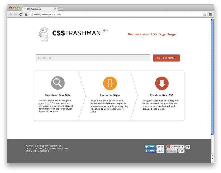 在大的項目中,保持 CSS 文件的簡潔和緊湊是非??针y的。不過不要擔心,CSS Trashman 可以幫助你。這個在線工具檢查您的網(wǎng)站,壓縮樣式,讓你下載一個超級干凈的版本的網(wǎng)站 CSS 文件,這樣你就可以安全地刪除它們。更多信息: http://www.csstrashman.com/