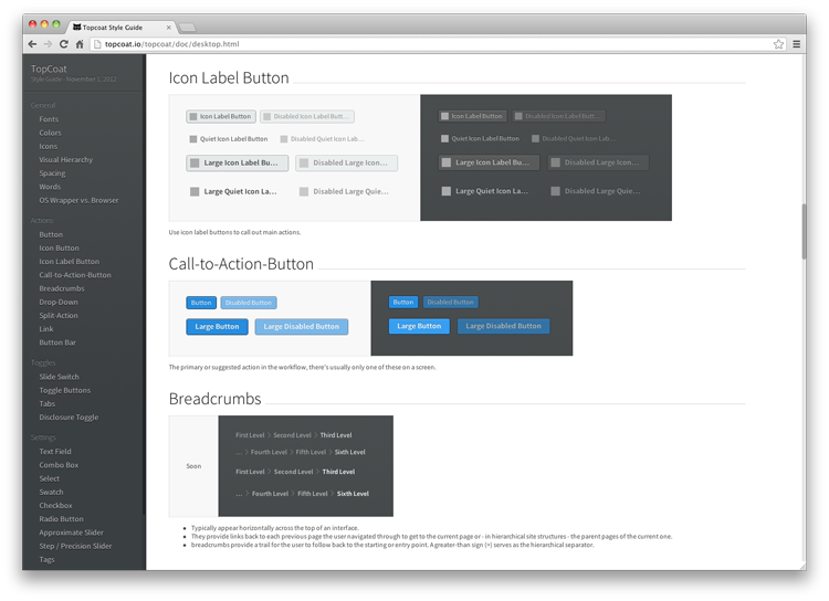 Topcoat 是一個 CSS 集合,用于簡潔和快速的 Web 應用程序開發(fā)。它是一個開源庫,不需要任何 JavaScript 內置的用戶界面元素。更多信息: http://topcoat.io/