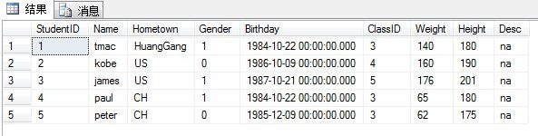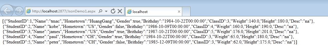 從表中我們可以看到一共有五條數(shù)據(jù),現(xiàn)在我們要從數(shù)據(jù)庫中取出這些數(shù)據(jù),然后利用JSON.NET的JsonConvert對象序列化它們?yōu)閖son字符串,并顯示在頁面上。C#代碼如下