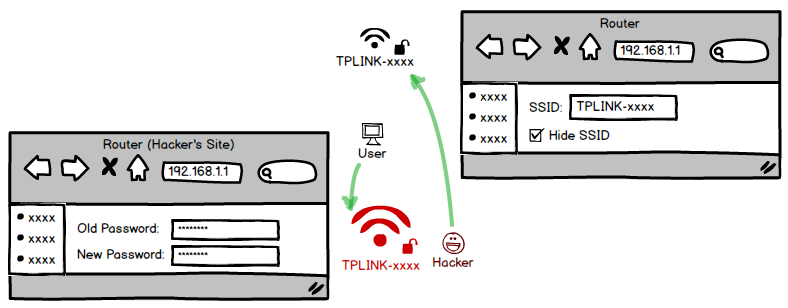 當(dāng)然,為了防止他之后進(jìn)入路由器改密碼,你必須立即隱藏 SSID,讓 Beacon 不再發(fā)出,這樣大家都看不見(jiàn)這臺(tái)設(shè)備了,只能通過(guò) BSSID(路由器 MAC 地址)來(lái)連接。但是人家會(huì)有疑問(wèn),剛恢復(fù)好的路由器怎么看不見(jiàn)?這時(shí)得事先建立一個(gè)釣魚(yú)熱點(diǎn),名字和那被隱藏的 SSID 一樣,將對(duì)方引誘到自己的蜜罐上。