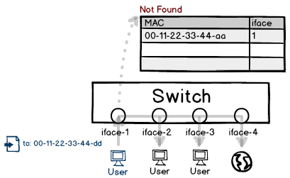 之前說(shuō)了集線器和交換機(jī)的轉(zhuǎn)發(fā)區(qū)別。如果交換機(jī)發(fā)現(xiàn)一個(gè)暫時(shí)還未學(xué)習(xí)到的 MAC 地址,將會(huì)把數(shù)據(jù)包送往何處呢?為了不丟包,只能是廣播到所有接口。