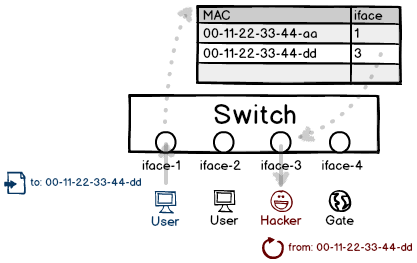 然而這種學(xué)習(xí)并不智能,甚至太過(guò)死板,任何一個(gè)道聽(tīng)途說(shuō)都會(huì)當(dāng)作真理。用戶發(fā)送一個(gè)自定義源 MAC 地址的包是非常容易的,因此交換機(jī)成了非常容易被忽悠的對(duì)象。只要偽造一個(gè)源地址,就能將這個(gè)地址關(guān)聯(lián)到自己的接口上,以此獲得受害者的流量。