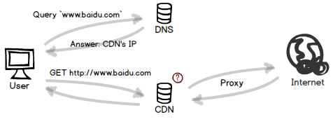 不同于黑客強(qiáng)制 DNS 把域名解析到自己的釣魚(yú) IP 上,CDN 則是讓 DNS 主動(dòng)配合,把域名解析到臨近的服務(wù)器上。這臺(tái)服務(wù)器同樣也開(kāi)啟了 HTTP 代理,讓用戶感覺(jué)不到 CDN 的存在。