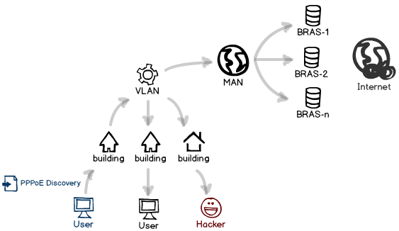 類(lèi)似 DHCP 協(xié)議,PPPoE 也是通過(guò)廣播來(lái)探尋有哪些可用的終端,意味著整個(gè)小區(qū)的內(nèi)網(wǎng)用戶都能收到;同時(shí)探尋包一直往上冒泡,直到被城域網(wǎng)的終端們收到,然后開(kāi)始紛紛回應(yīng)。
