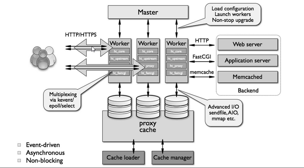 從這個圖表中我們可以看出,Nginx使用FastCGI進(jìn)程來執(zhí)行Python,Ruby以及其他代碼,使用Memcached對象緩存系統(tǒng)。工作進(jìn)程為HTTP請求加載ht_core Nginx進(jìn)程。我們還可以看到,Nginx和Windows以及Linux內(nèi)核的功能緊密的集成在了一起,以便提升性能。這些內(nèi)核功能已經(jīng)經(jīng)過長時間的改良,而Nginx正是利用了這一點(diǎn)。