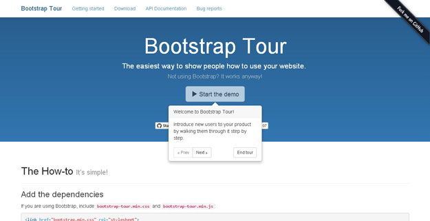 Twitter Bootstrap Popovers通過快速簡便的方法來建立你們的產(chǎn)品教程。 此庫不依賴于完整的Bootstrap 程序包。 唯一的依賴是tooltip 和popover 文件。Bootstrap Tour 保存了當(dāng)前步驟,如果用戶已經(jīng)讀完,不會再次顯示教程。