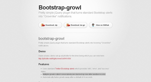 非常簡單的jQuery插件,可以讓標(biāo)準(zhǔn)的Bootstrap 提示變成進(jìn)入懸停時“咆哮般”提示。 它具有許多的功能,比如它使用標(biāo)準(zhǔn)的Twitter Bootstrap 提示,包括'info','error',和'success'的風(fēng)格,還支持連續(xù)多個咆哮般調(diào)用,層疊在一個列表。
