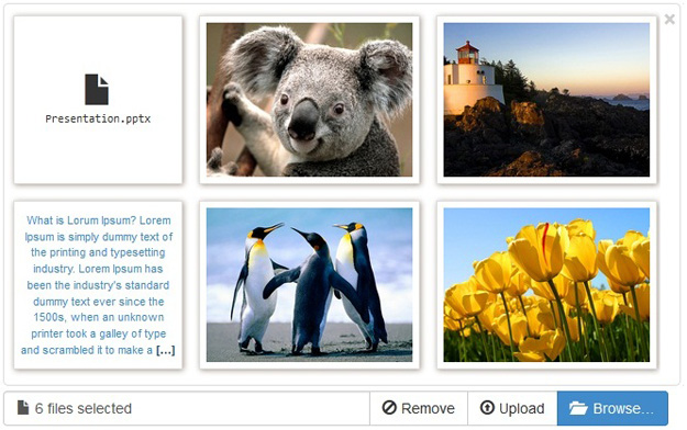 Bootstrap3.x 的一個增強(qiáng)版的HTML 5 文件選擇控件,可以對圖片文件和文本文件進(jìn)行預(yù)覽,以及其他功能。該插件增強(qiáng)了這些插件,并且將組件的初始化簡化為一個簡單的HTML文件字段。它同時還提供了多個文件預(yù)覽的功能包括圖片和文本文件。