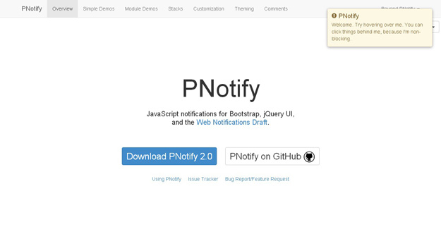 PNotify 是一個由SciActive 開發(fā)的 JavaScript的通知插件,曾用名Pines Notify。它的設(shè)計(jì)理念是提供一個極度靈活而又非常容易實(shí)現(xiàn)和使用。它可以提供非阻塞的通知。允許用戶在不關(guān)閉它的情況下點(diǎn)擊通知后面的元素。PNotify 使用了Bootstrap 和 jQuery UI來定義樣式,這意味著可以非常容易的對它進(jìn)行自定義主題樣式。