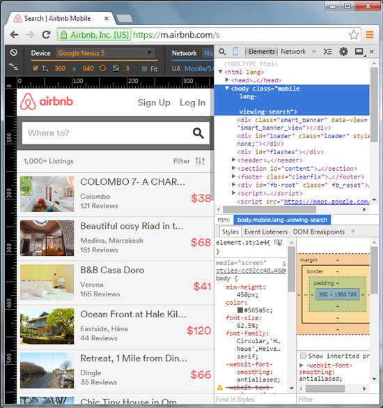 啟動 DevTools 并點擊移動設備圖標然后點擊 loop/search(循環(huán)/搜索),打開移動設備模擬器,截圖如上所示。正如你所看到的,上面的模擬器已經配備了標尺,因此你可以清楚看到網站視窗的尺寸大小。