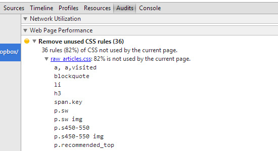現在你可以對你的 CSS 進行審核,比如檢查沒有在 web 頁面使用的無用的樣式規(guī)則。在“Audits”(審核)選項,點擊“Run”(運行)按鈕,你將會看到一個目前在該頁面沒有使用到的類/選擇器的列表,如下圖所示: