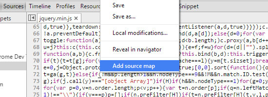 要做到這一點的話,首先你要確保處于源面板,接著打開一個文件,在那之后右鍵單擊并選擇 Add Source Map. 添加到 .map 文件。