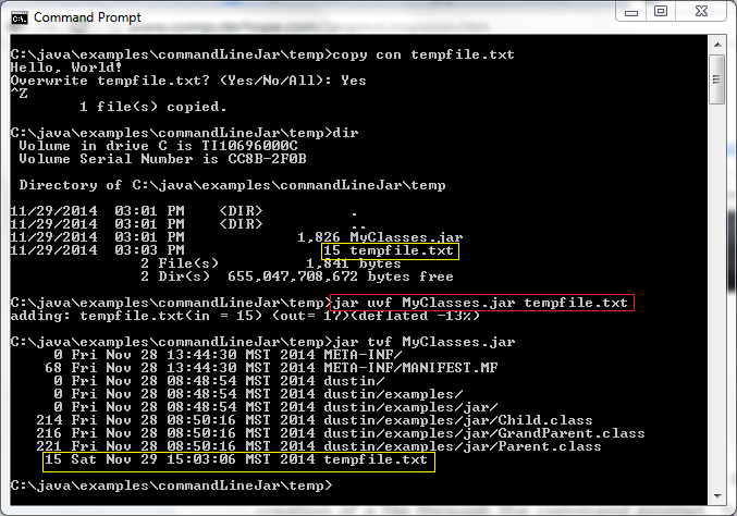 之前的例子已經(jīng)展示了提供“c”選項給jar命令去創(chuàng)建了一個歸檔,提供“t”選項列出歸檔內(nèi)容,和提供“x”選項去提取一個歸檔內(nèi)容。另一個經(jīng)常使用的功能是更新一個存在的歸檔內(nèi)容,這使用jar的“u”選項來完成。下一個屏幕快照展示了創(chuàng)建一個叫tempfile.txt的文本文件(在DOS里使用copy con 命令)然后使用jar uvf MyClasses.jar tempfile.txt去更新MyClass.jar并把tempfile.txt添加到JAR里