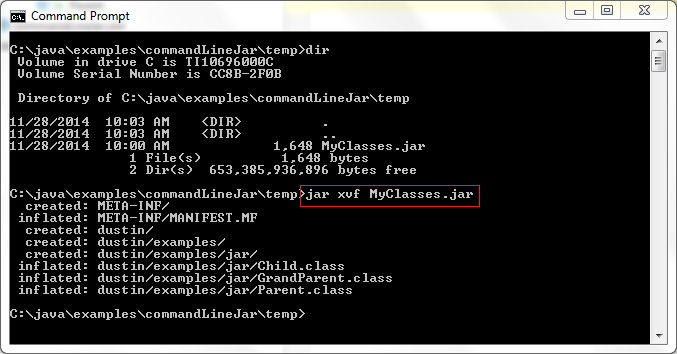 我有時僅僅需要去查看獲取使用歸檔文件中的一個或者兩個文件。盡管我可以明確地把它們?nèi)继崛〕鰜砭庉嬑倚枰庉嫷奈募?,就像在上面那個例子展示的一樣。但是我想僅僅去提取我需要的少量文件。使用命令jar xvf命令就可以輕松做到。通過在文件名后指定特定的權(quán)限定名,我可以僅提取出我指定的文件。這有一個好處:我不用被我不需要的文件占滿了我的目錄并且在我完事后不需要費心去清理無用文件。下一個屏幕快照展示了運行命令jar xvf MyClasses.jar dustin/examples/jar/GrandParent.class去提取一個單一的文件,而不是提取全部文件。