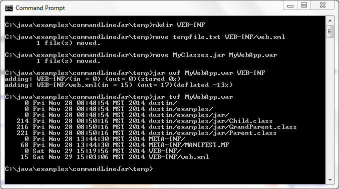 在這篇文章里的所有例子都是針對JAR文件,但這些例子是處理WAR和EAR文件的。z作為一個最簡單的例子,下一個屏幕快照展示了使用命令jar uvf去更新一個新的web描述到WAR文件。文件的實際內(nèi)容對這個例子的影響不大。重點是明白這:一個WAR文件可以像處理JAR文件一樣被操作。這同樣適用于EAR文件。