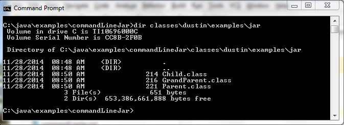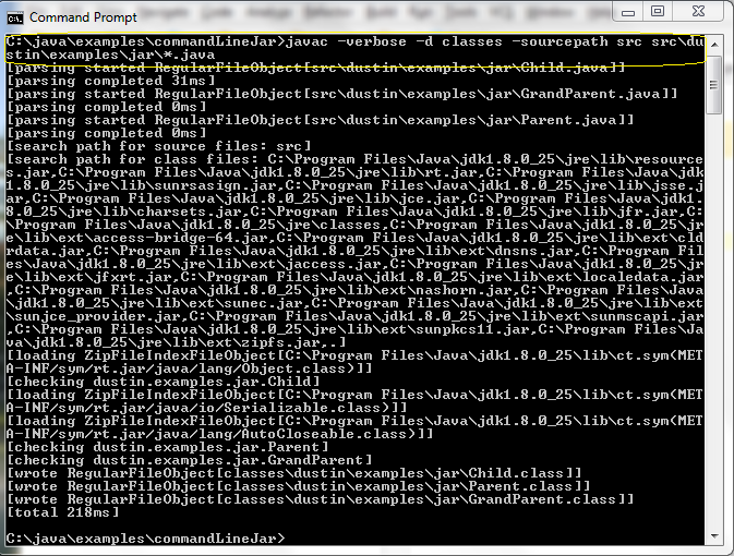 在我的例子里,我打算去用jar歸檔和處理一些.class文件。下面的屏幕快照展示了編譯一些java源代碼文件(.Java文件)為.class文件。這些文件的實際源碼和這次討論的內(nèi)容關(guān)系不大,所以不在這展示了。我已經(jīng)在這篇文章里展示了不用IDE直接使用命令行工具來編譯這些文件。