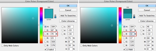 使用 HSB 來考慮色彩最大的好處是比較直觀,當(dāng)你調(diào)整色相(H),飽和度(S) 或亮度(B)中的某一項(xiàng)時,基本可以大概知道色彩會發(fā)生什么變化,這樣我們就可以選出比較可控的又“不難看”的色彩搭配。比如說,我們可能選擇了某一種色彩作為鏈接的色彩,那么就可以保持該色彩的色相(H), 飽和度(S) 值不變,只調(diào)整亮度(B) 的值,這樣就順利得到了一種比較深的色彩,可以用來做 :hover 色彩,如圖: