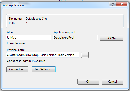 然后設(shè)置必填信息:別名,物理路徑,應(yīng)用池,用戶認證信息,點擊OK。