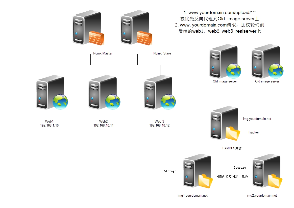 首先,關(guān)閉舊版本上傳入口(避免繼續(xù)使用導(dǎo)致數(shù)據(jù)不一致)。將舊圖片數(shù)據(jù)通過rsync工具一次性遷移到獨立的圖片服務(wù)器上(即下圖中描述的Old Image Server)。在最前端(七層代理,如Haproxy、Nginx)用ACL(訪問規(guī)則控制),將舊圖片對應(yīng)URL規(guī)則的請求(正則)匹配到,然后將請求直接轉(zhuǎn)發(fā)指定的web 服務(wù)器列表,在該列表中的服務(wù)器上配置好提供圖片(以Web方式)訪問的站點,并加入緩存策略。這樣實現(xiàn)舊圖片服務(wù)器的分離和緩存,兼容了舊圖片的訪問規(guī)則并提升舊圖片訪問效率,也避免了實時同步所帶來的問題。