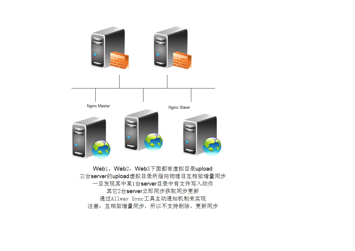上述架構(gòu)中只能在這幾臺Web服務(wù)器上互相“增量同步”,這樣一來,就不支持文件的“刪除、更新”操作的同步了。