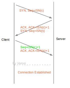 ISN交換是通過SYN片段實現(xiàn)的。SYN片段由頭部的SYN位表明,它的序號為發(fā)送方的ISN。該片段由連接的一方首先發(fā)給給另一方,我們將發(fā)送SYN的一方稱為客戶(client),而接收SYN的一方稱為服務器(server)。我們使用ISN(c)表示client一方的ISN,使用ISN(s)表示server一方的ISN。隨后,接收到SYN的server需要回復ACK,并發(fā)送出包含有server的ISN的SYN片段。下圖為建立連接的過程,也就是經(jīng)典的TCP三次握手(three-way handshaking)。兩條豎直線分別為client和server的時間軸。每個箭頭代表了一次TCP片段的單向傳輸。
