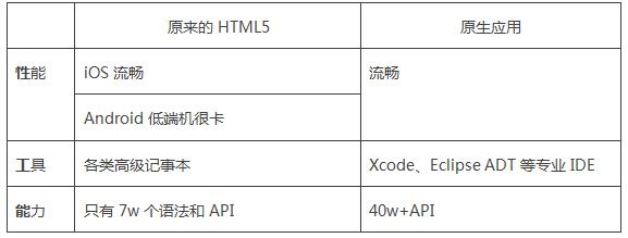 我們先談?wù)凥TML5原來不如原生應(yīng)用的地方,業(yè)內(nèi)俗稱HTML5有“性工能”障礙。即HTML5性能不如原生、開發(fā)工具不如原生、能力調(diào)用不如原生。