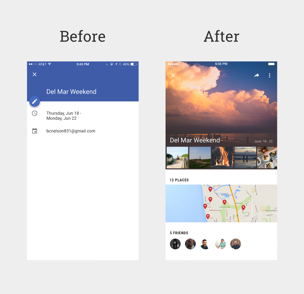 你的日歷應當包含你所做過的所有有趣的事情,讓回憶與溫故成為一件輕松的事情。在這個設計示例中,日歷用個人信息、圖片、視頻、地圖來展現(xiàn)你一次周末旅行的全貌。