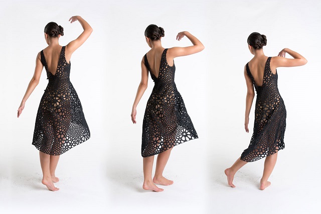 在定制化生產(chǎn)之后,服裝生產(chǎn)的下一步可能就會(huì)進(jìn)入 3D 打印時(shí)代,該技術(shù)允許你按照自己的設(shè)計(jì)一次只打印一件成品。人們將進(jìn)入「實(shí)時(shí)消費(fèi)」階段:你可以每天為自己打印不同的鞋子與耳環(huán)。如今花不到 100 美元你就可以獲得 3D 打印的定制珠寶,3D 打印的鞋子也為之不遠(yuǎn)了。Nervous System 設(shè)計(jì)工作室甚至能夠?yàn)橛脩?hù)提供名為 Kinematics 的 3D 打印晚禮服。這款 3D 打印晚禮服所使用的服裝材料為數(shù)千個(gè)相互連接的硬體塑料環(huán)。3D 打印服飾通常需要在打印之后另行組裝,因?yàn)樗鼈凅w積太大無(wú)法一次性打印完畢。Kinematics 的制作過(guò)程也是如此,你需要將其打印成一整張,然后經(jīng)過(guò)折疊成為最終成品。3D 打印的晚禮服一件就需要約 4000 美元,因此距今為止只賣(mài)出了不到 12 件(其中還有一件去年被紐約現(xiàn)代藝術(shù)博物館購(gòu)買(mǎi)作為藏品)。